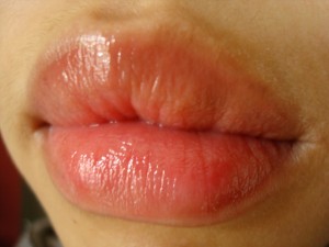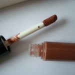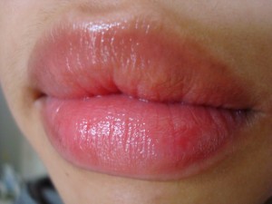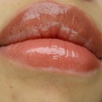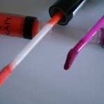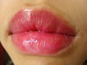 When uncapped, I noticed the scent of the gloss bar. I didn’t so much smell the 03 Juicy Apple, but for some reason 09 Neon Red had that sweet cherry-strawberry flavor reminiscent of children’s lip balms or cough medicine. The actual gloss bar is a creamy column that extends to about one inch via twisting the bottom tube, which I suppose is an average amount of gloss when compared to other lip products. I had some difficulty getting the 09 Neon Red bar to retract and ended up having to use my finger to gently press it back inside the plastic tube.